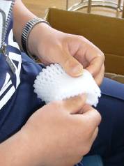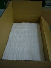 くだものに被せる発泡ポリエチレン製の緩衝材を折り返して揃えて束ねます。箱に詰めて完成です。