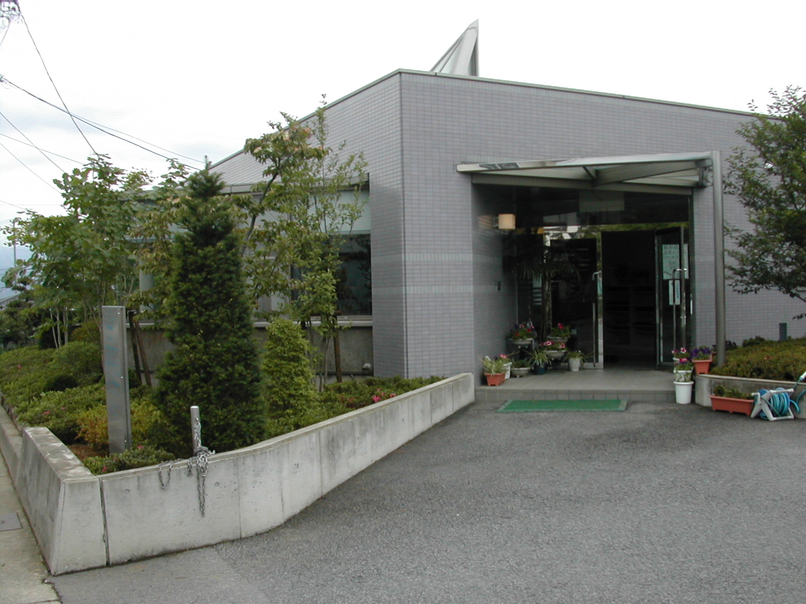 道路に対して斜めの向きに入り口があります。